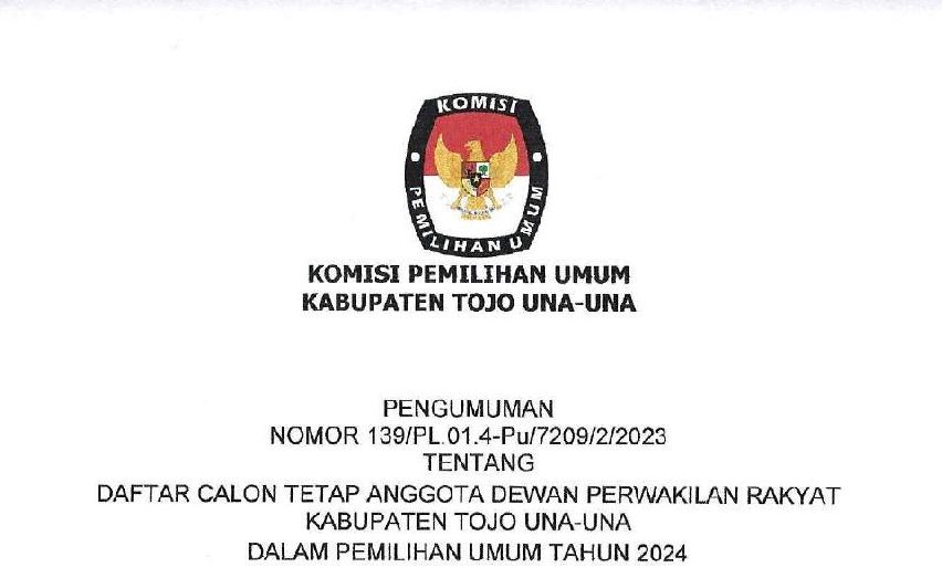 TOUNA – Bahwa untuk melaksanakan ketentuan Pasal 85 ayat (1) Peraturan KPU Nomor 10 Tahun  2023  tentang  Pencalonan  Anggota  Dewan  Perwakilan  Rakyat,  Dewan Perwakilan   Rakyat   Daerah   Provinsi,  dan  Dewan   Perwakilan   Rakyat   Daerah Kabupaten/Kota. Berdasarkan  Keputusan  Komisi  Pemilihan  Umum  Kabupaten Tojo Una-Una, Nomor 268 Tahun 2023 tentang Daftar Calon Tetap Anggota  Dewan Perwakilan Rakyat Kabupaten  Tojo Una-Una  Dalam Pemilihan  Umum Tahun 2024 tanggal  3 November  2023. Komisi  Pemilihan  Umum  mengumumkan  Daftar  Calon Tetap (DCT) Anggota  Dewan Perwakilan Rakyat Daerah Kabupaten ‘Tojo  Una-Una. dan persentase keterwakilan  perempuan  dalam  DCT sebagaimana  terlampir.
