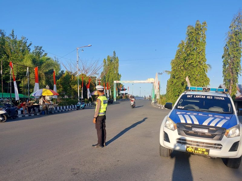 TOUNA – Satlantas Polres Touna memberikan pelayanan kepada masyarakat dengan melakukan pengaturan lalu lintas di Jalan Yos. Sudarso, tepatnya di depan Touna Fest Ramadhan 2024, Minggu (24/3/2024).