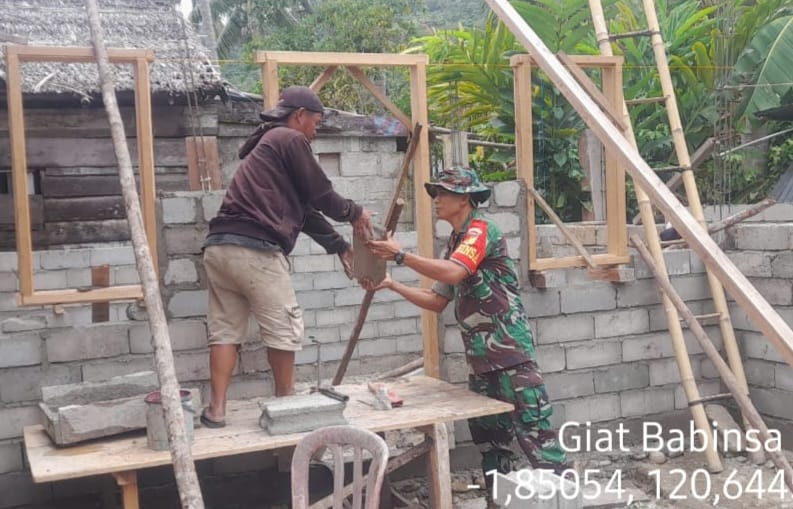 POSO – Babinsa Koramil 02/Pamona Puselemba Kodim 1307/Poso, Serda Semuel B membantu tukang bangunan yang sedang bekerja membangun salah satu dapur rumah warga binaan, bertempat di Desa Peura, Kecamatan Pamona Puselemba, Kabupaten Poso, Rabu (3/4).