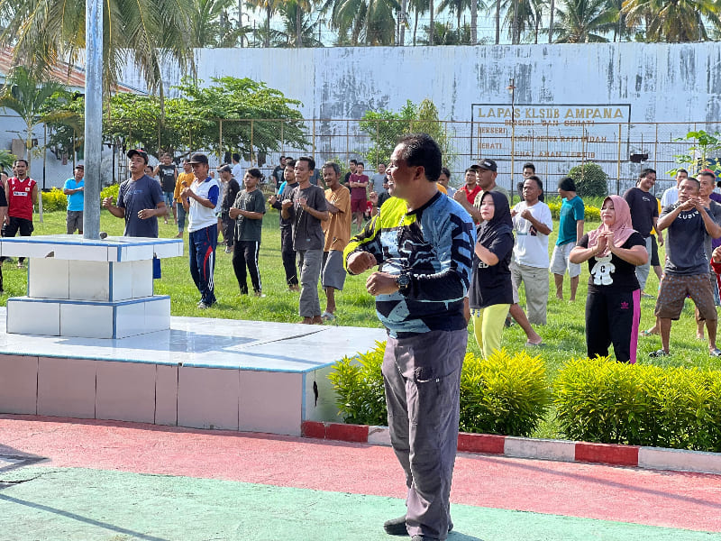 TOUNA – Lembaga Pemasyarakatan (Lapas) Kelas IIB Ampana mengadakan kegiatan senam bersama pada Jumat pagi, melibatkan pegawai dan warga binaan dengan penuh semangat.