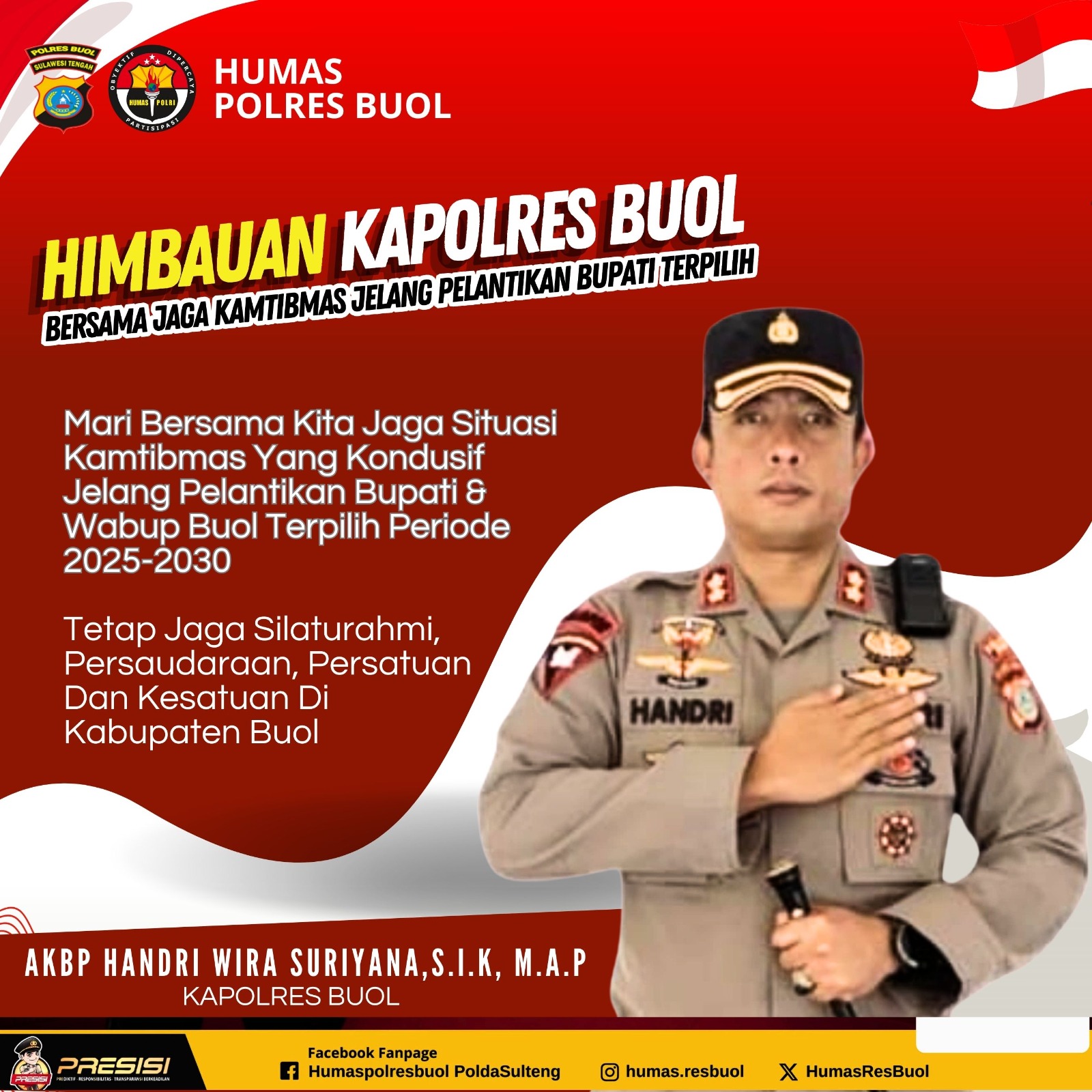 Kapolres Buol AKBP Handri Wira Suriyana, S.I.K, M.A.P. menghimbau kepada seluruh warga masyarakat Kabupaten Buol untuk bersama-sama menjaga Kamtibmas menjelang Pelantikan Bupati dan Wakil Bupati Buol terpilih 2025-2030.