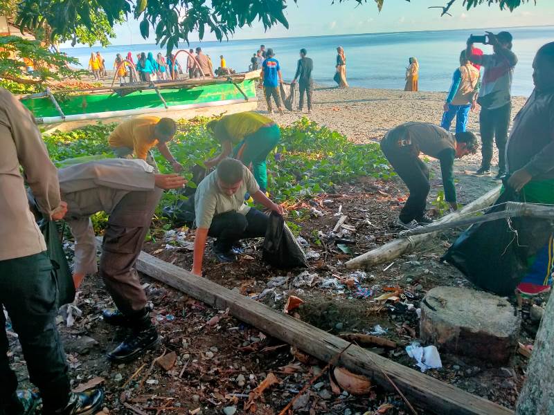 Setelah pelaksanaan apel, seluruh personel dan OPD lingkup Pemda Tojo Una Una dibagikan kantonng sampah kemudian melakukan pembersihan dan mengangkat sampah disepanjang pantai Taman JH.