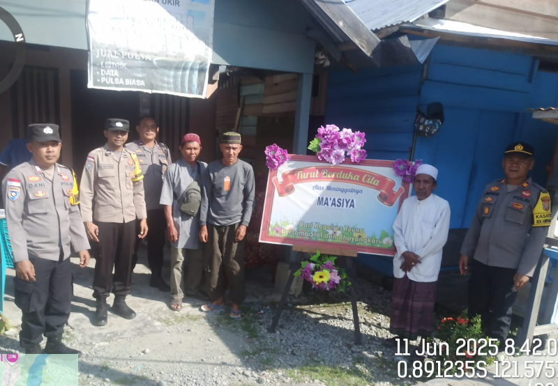 TOUNA – Kapolsek Ampana Kota Iptu Maryanto melayat kerumah duka warganya yang meninggal dunia di Jl. Tadulako, Dusun Pandalengi, Kelurahan Ampana, Kecamatan Ampana Kota, Rabu (11/6/2025).