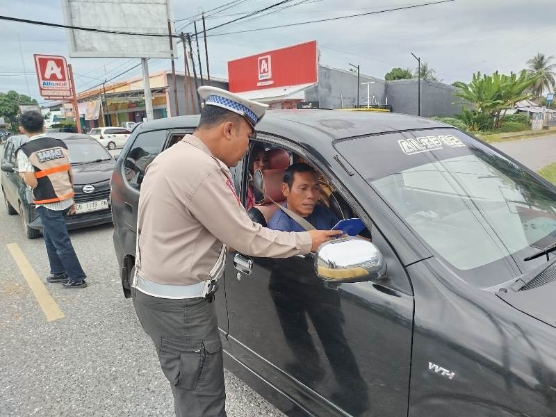 Petugas membagikan stiker dan brosur himbauan kepada pengguna jalan, baik pengendara roda dua maupun roda empat atau lebih. Aksi ini bertujuan agar masyarakat memahami arti pentingnya keselamatan saat berkendara.