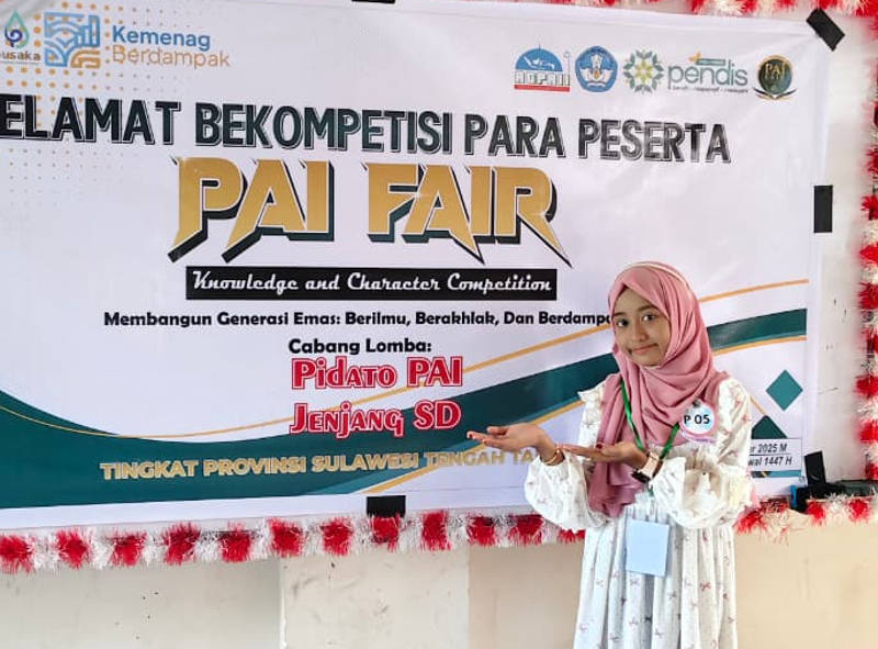 PALU – Aqifah M. Djewet Siswi Kelas V SDN 4 Ratolindo, Kecamatan Ratolindo Kabupaten Tojo Una-Una berhasil meraih prestasi membanggakan pada lomba pidato tingkat Sekolah Dasar di Pentas Keterampilan Seni Pendidikan Agama Islam (PAI) Sulawesi Tengah tahun 2025, Sabtu Malam (8/11/2025).