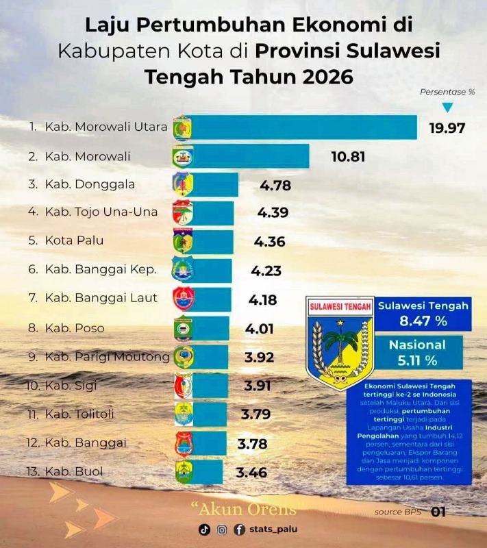 TOUNA – Pertumbuhan ekonomi Provinsi Sulawesi Tengah terus menunjukkan kinerja yang impresif di tingkat nasional. Berdasarkan berbagai sumber data dan informasi statistik di Instagram Status Palu ( 23/3/2026), Provinsi Sulawesi Tengah menempati posisi kedua pertumbuhan ekonomi tertinggi di Indonesia, setelah Maluku Utara.