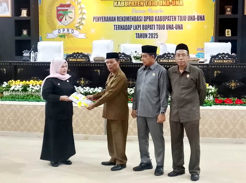 TOUNA – Dewan Perwakilan Rakyat Daerah (DPRD) Kabupaten Tojo Una-Una menggelar Rapat Paripurna dengan agenda penyampaian rekomendasi terhadap Laporan Keterangan Pertanggungjawaban (LKPJ) Bupati tahun 2025 yang dilaksanakan di Ruang Sidang Utama Kantor DPRD Tojo Una-Una, Rabu (22/4/2026).