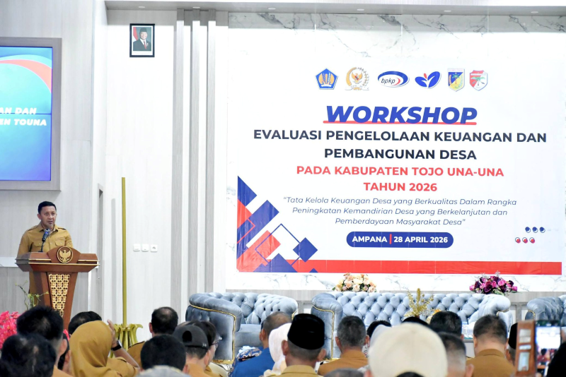 TOUNA Pemerintah Kabupaten Tojo Una Una menggelar Workshop Evaluasi Pengelolaan Keuangan dan Pembangunan Desa sebagai upaya memperkuat tata kelola Pemerintahan Desa yang transparan dan akuntabel, di Auditorium Kantor Bupati, Selasa (28/4/2026).